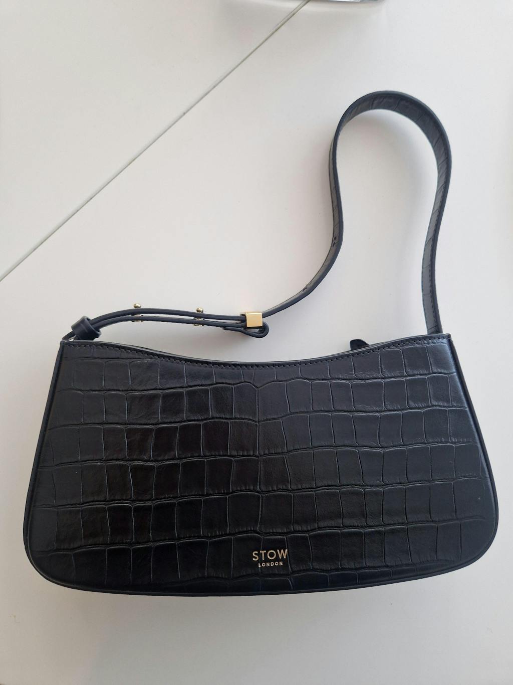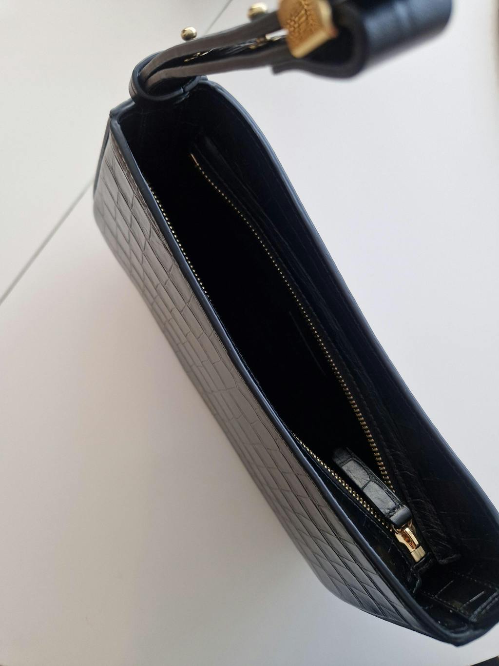 Refined and effortlessly bold, the Post Shoulder Bag in Black croc-embossed leather adds high-shine sophistication to your everyday. Handmade in Ubrique, Spain using LWG-certified Italian calfskin, it features gold-coated hardware, a feathered strap, zip closure and organic cotton lining with an internal slip pocket. Designed for versatility and crafted with zero plastic reinforcement, this timeless piece elevates any occasion with style and substance.