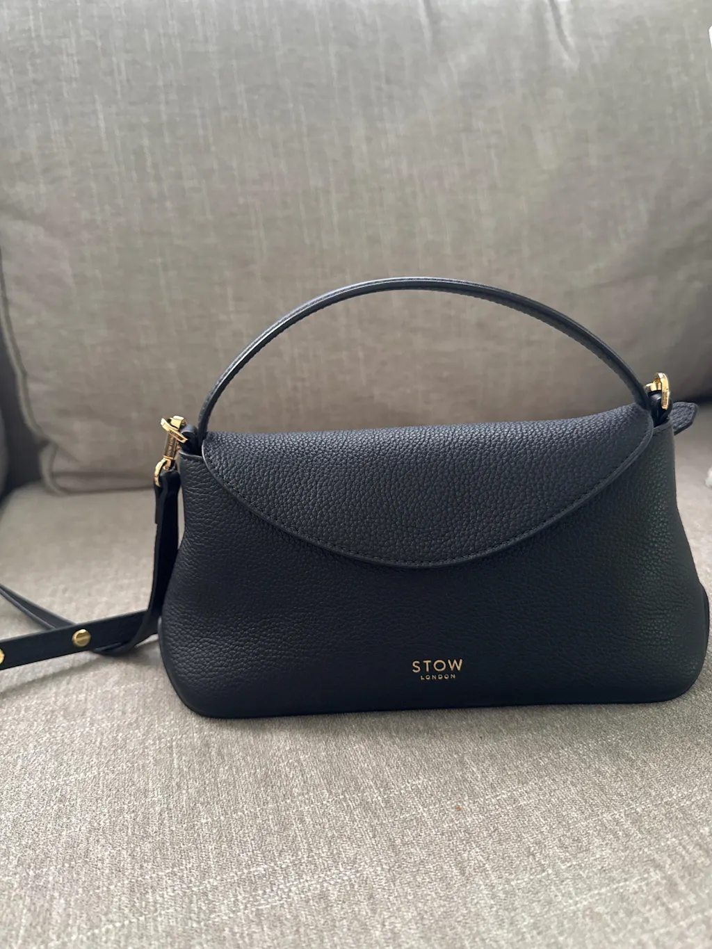 The Mini East West in black pebbled leather handbag preserves its full-size counterpart's elegant curved silhouette while offering streamlined dimensions for today's dynamic lifestyle. Expertly constructed from exceptional Curtidos Badia b leather featuring refined smooth black leather details on the base and handle. Enhanced with sumptuous bonded suede interior featuring a convenient internal card holder pocket and bespoke stainless steel fittings, this design seamlessly blends STOW's time-honored artisanship and superior materials with modern style sensibilities. This versatile mini East West handbag comes complete with a removable adjustable, full leather strap, enabling the piece to be carried on the shoulder or worn crossbody. Meticulously handcrafted in Ubrique, Spain.