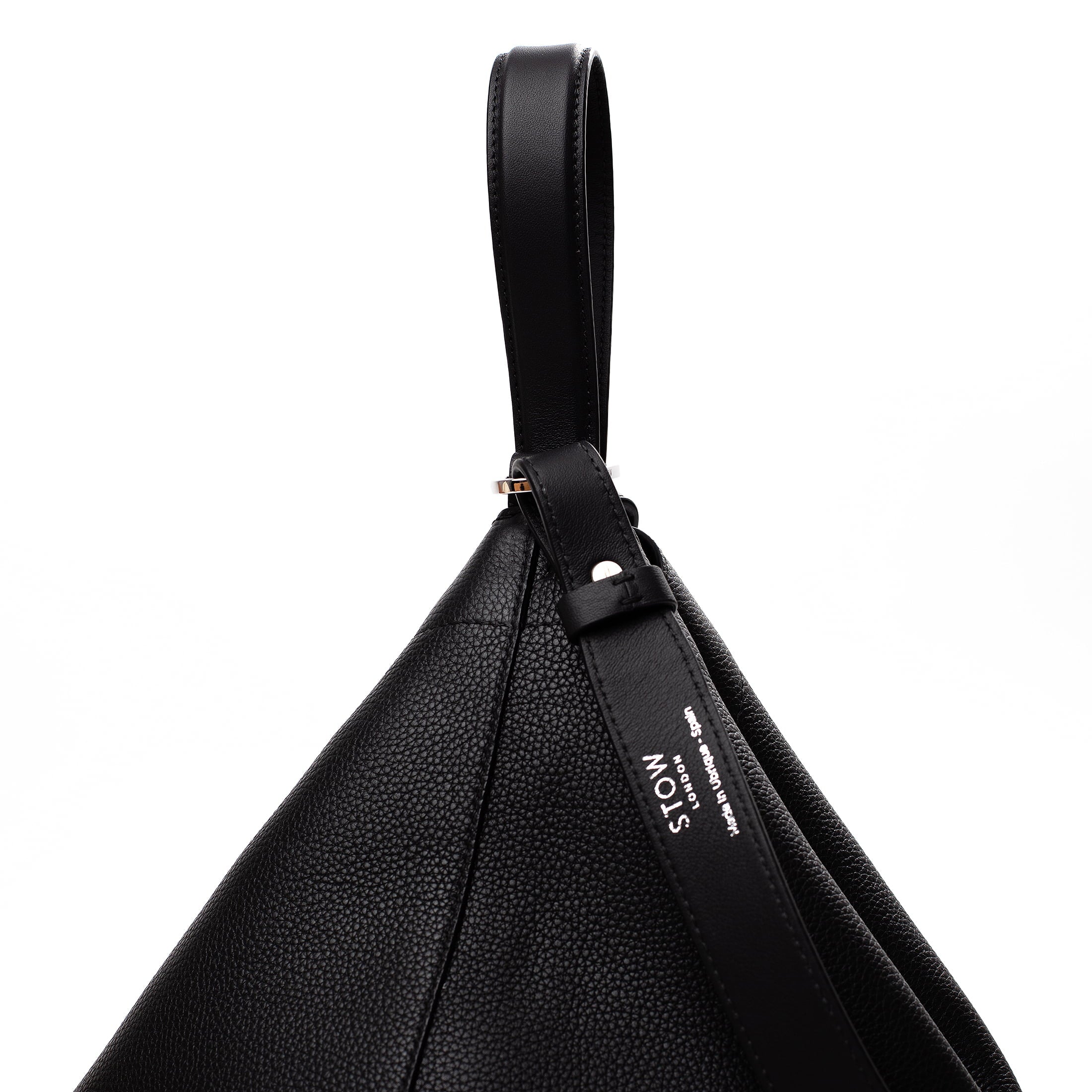 The Curve Bag in Black smooth and pebbled leather is a staple of STOW’s ethically crafted collection. Handmade in our own factory in Ubrique, Spain, it features invisible magnets for multiple styling options and a raw-polished hardware clip for added security. The bonded suede interior delivers unmatched luxury. Includes a detachable leather strap and a zip pouch that functions as both an interior pocket and clutch. Crafted with LWG-certified leather and designed with sustainability in mind. Also available with gold hardware. Custom hardware made in stainless steel with raw-polished finish technology - the most sustainable and durable hardware available. Pouch can be personalised in fine silver emboss.