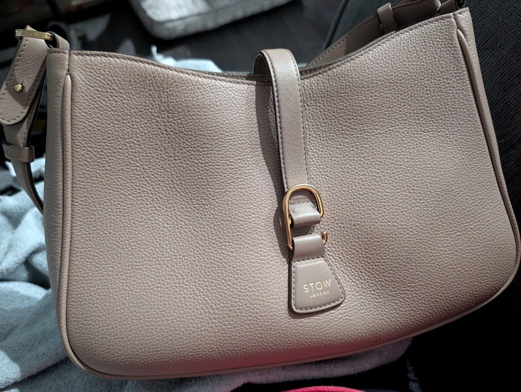 The Beth Shoulder Bag in Cloud Grey smooth and pebbled leather offers refined structure and signature STOW detailing. Its custom gold-coated hardware, zip closure, and organic cotton-lined interior deliver sustainable luxury. Adjustable via embossed strap keepers and crafted with soft-turned construction for everyday comfort. Includes a leather shoulder strap and interior slip pocket. Crossbody strap sold separately. Handmade in Ubrique, Spain.