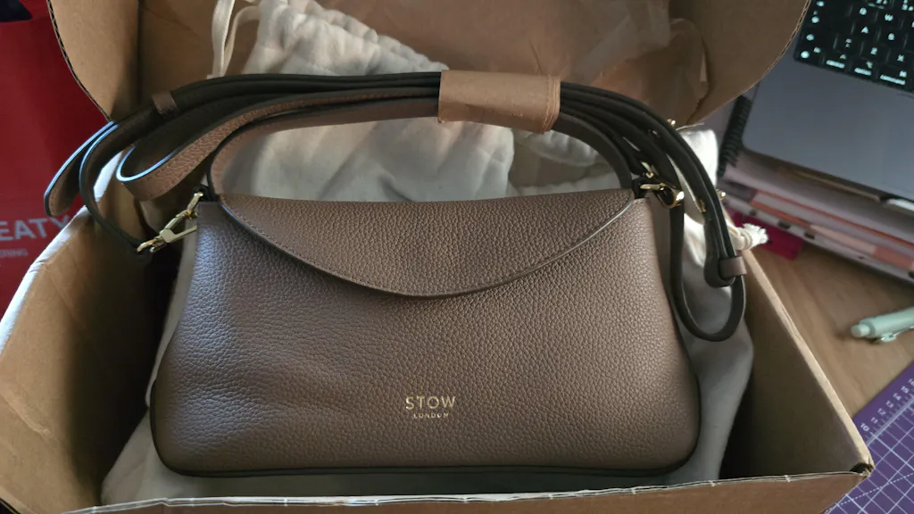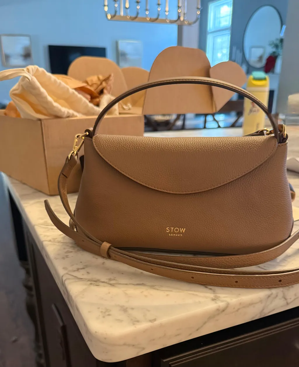 Our Mocha Mini East West leather handbag maintains the distinctive curved architecture of its full-sized sibling while delivering sleek proportions ideal for modern living. Meticulously fashioned from premium Curtidos Badia Mocha pebbled leather, complemented by polished smooth leather detailing across the base and handle and strap. The interior showcases plush bonded suede with an integrated card holder compartment, while custom-forged stainless steel elements complete the look. This sophisticated yet simple design unites STOW's traditional expertise with exceptional material selection. The versatile Mini East West handbag features a detachable and adjustable leather strap, transforming effortlessly between a hand held bag and crossbody use. Artisan-made in Ubrique, Spain.